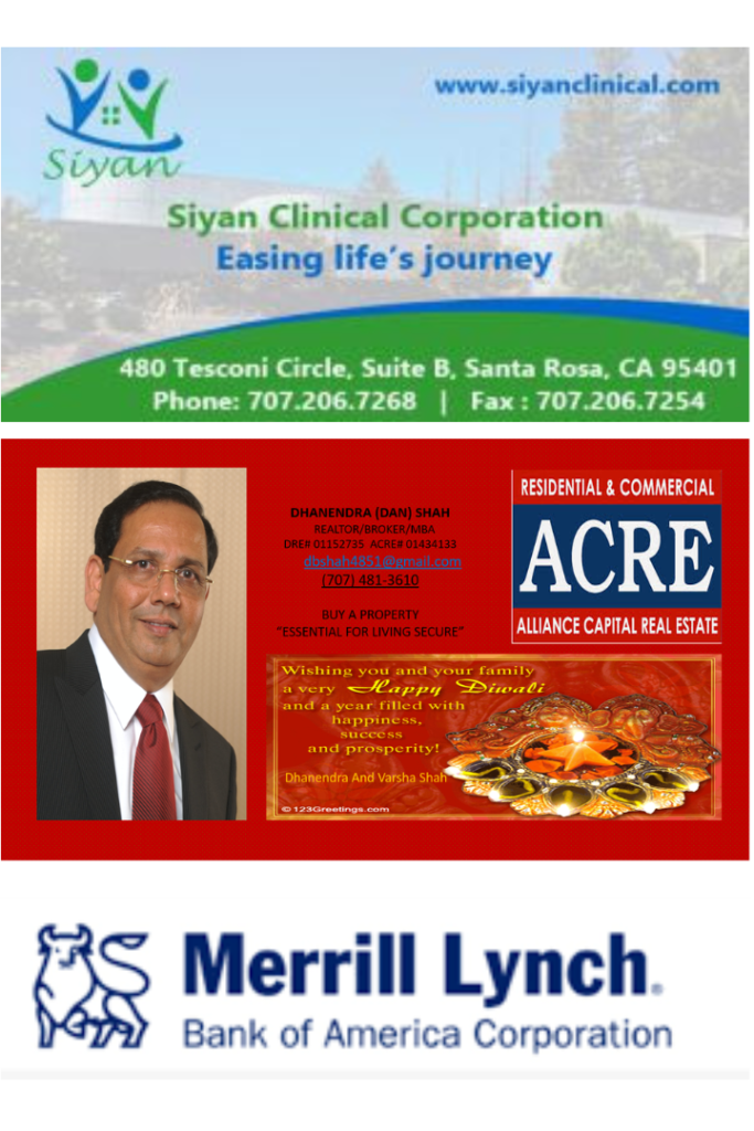 Platinum Sponsors: ACRE Real Estate, Dhanendra (Dan) Shah, Realtor; Siyan Clinical Corporation, Dr Ashish Shah and Dr. Paulomi Shah; NeilMed Pharmaceuticals, Dr. Ketan Mehta and Nina Mehta